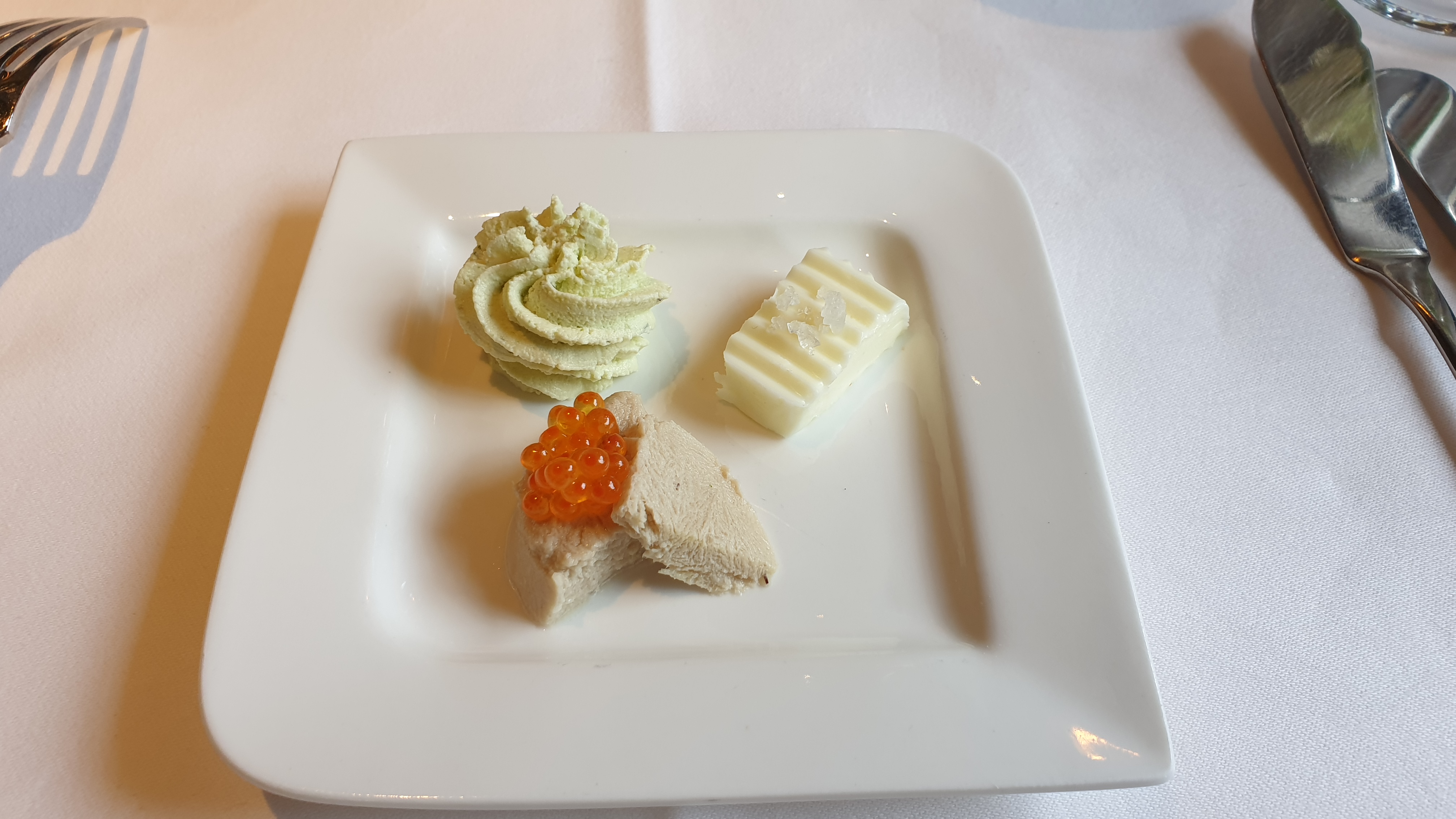 에피타이저(Vorspeise)로 허브버터(Kräuterbutter), 소금이 올려진 치즈, 연어알이 올려진 피쉬 페이스트(Fischpaste)와 곁들여 먹을 수 있는 빵이 나왔습니다. 부드럽고 맛있었습니다.