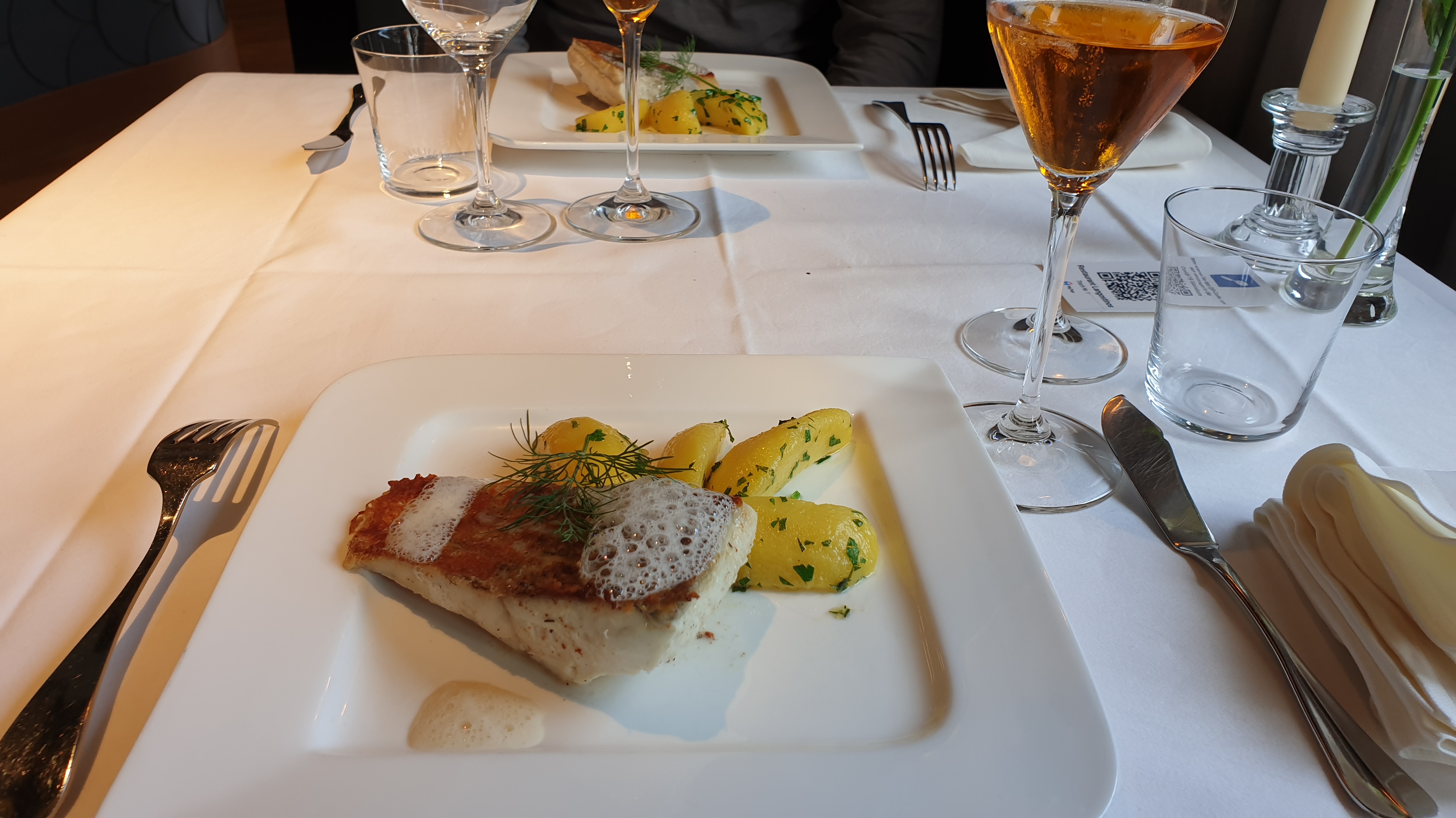 주메뉴였던 Hechtsteak. Hecht(강꼬치고기, Northen pike)라는 생선을 처음 먹어보았는데, 흰색 살이 매우 부드러웠습니다. 조리도 생선 고유의 맛을 잘 살리도록 되어 있었습니다. 레스토랑 직원분이 갓잡은 생선이라고 했는데 정말 신선하고 건강한 맛이었습니다. 사진을 보면 군침이 돌며 다시 먹고 싶을 정도로 맛있었습니다.