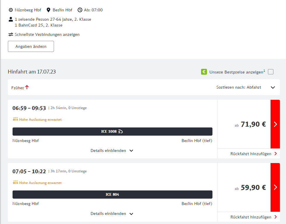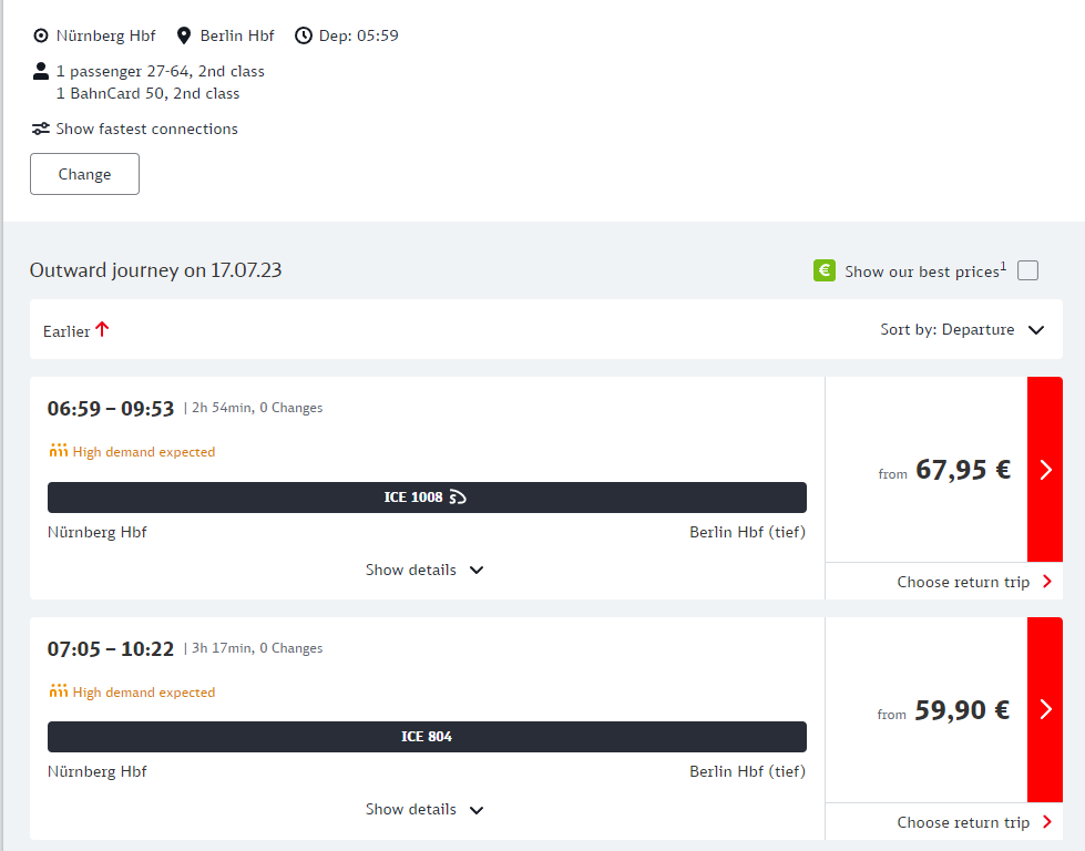 반카드50을 선택하면 67,95유로, 59,90유로이니 50퍼센트 할인은 아니네요. 두번째 시간대는 심지어 반카드25로 할인된 가격과 같습니다. 반카드50의 경우 원래 티켓의 종류가 Flexpreis일 경우 50%, Sparpreis일 경우 25% 할인이 적용된다고 하네요.