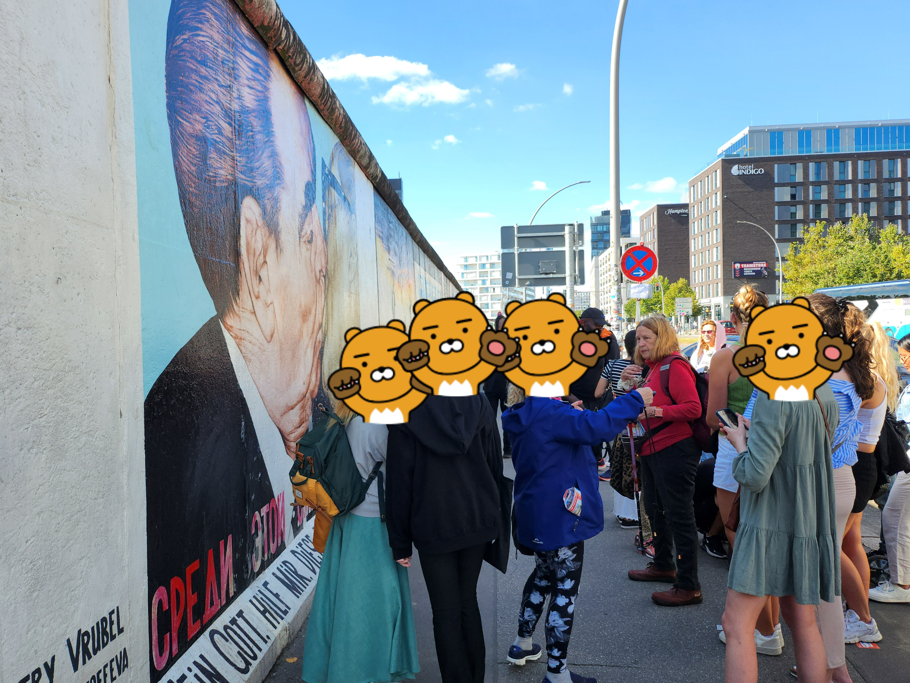 가는 길에 과거 베를린 장벽이었던 일부였던 곳에 예술가들이 그림을 그린 이스트 사이드 갤러리도 보았습니다. 사람들로 너무 붐벼서 사진을 찍기 어려웠습니다.