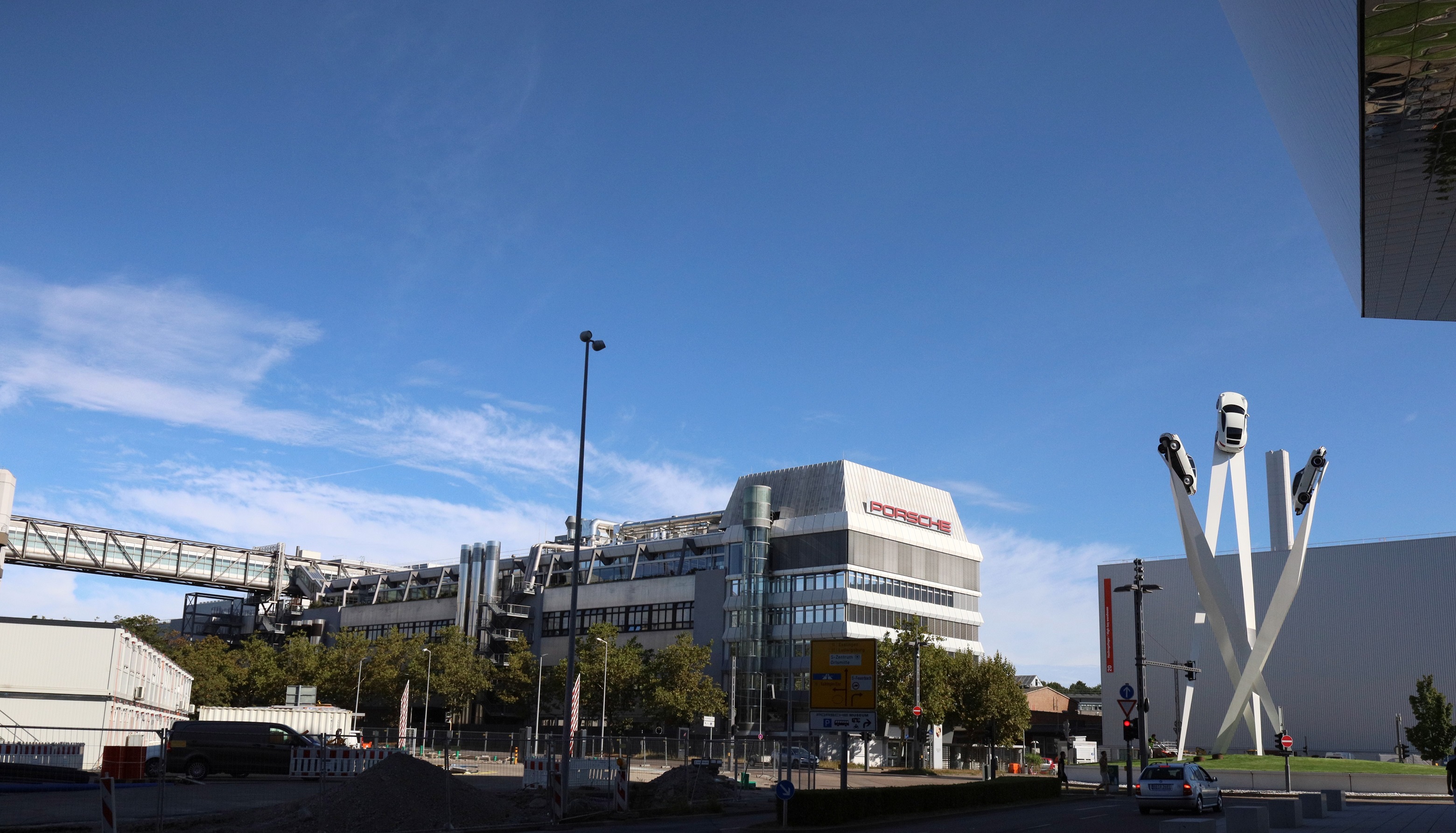 박물관 앞에 도착하니 포르쉐 로고 새겨진 대형간판과 자동차가 공중에 떠있는 조형물로 포르쉐 영역에 와 있구나 하는 느낌을 받았습니다.