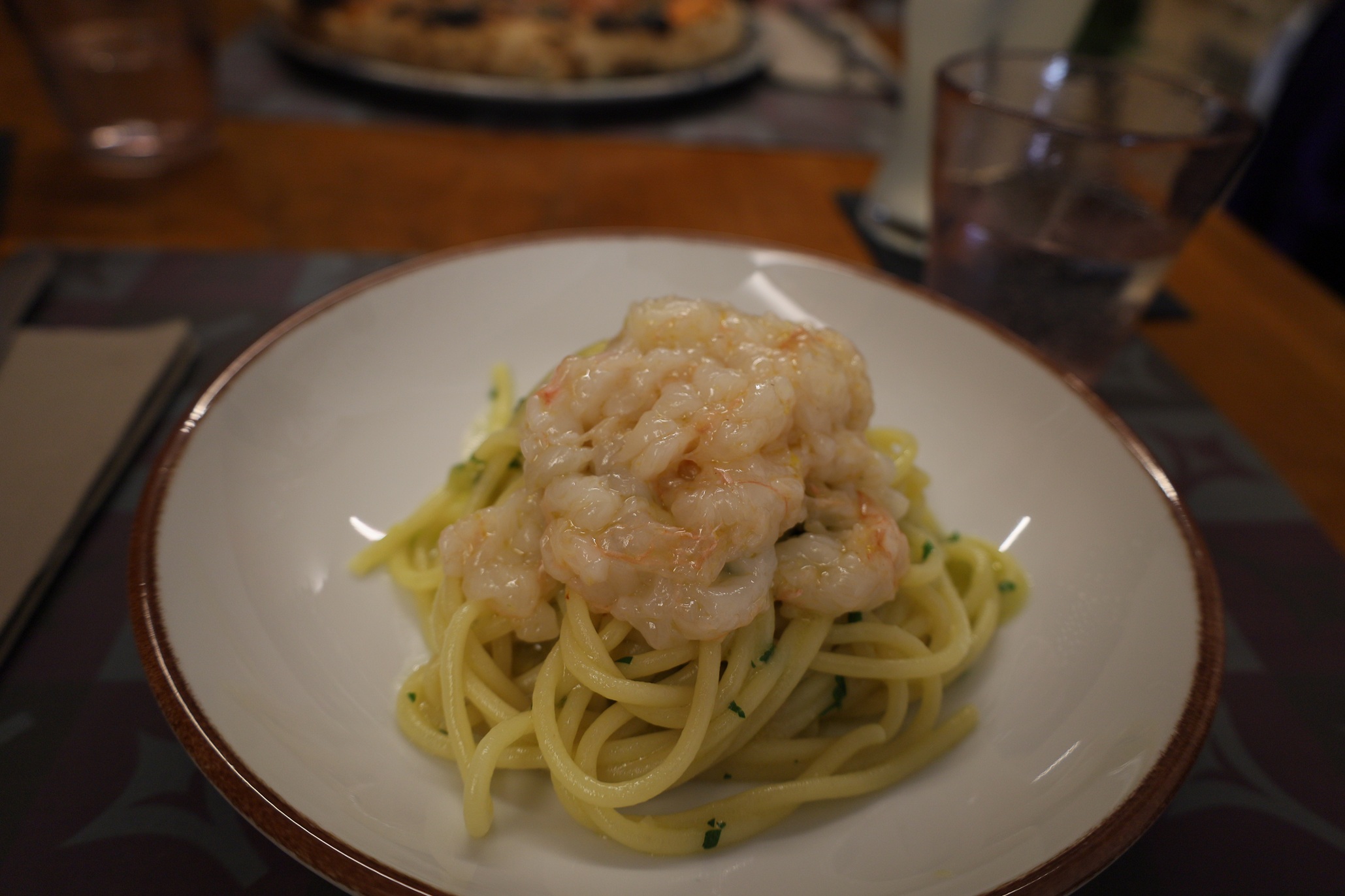 호텔에 도착해 짐을 풀고 나니, 점심 시간이 되어 식당을 찾았습니다. 전에 이탈리아 여행을 할때 음식이 맛있었던 기억이 있어서 기대를 많이 했습니다. 해산물이 있는 메뉴를 찾아서 새우가 들어간 파스타(spaghetti ai gamberi)를 선택했습니다. 그런데 예상과 달리 입에서 미끌미끌하고 음식이 입맛에 그다지 맞지 않았습니다. 남편은 피자를 주문했는데 맛있다고 했습니다.