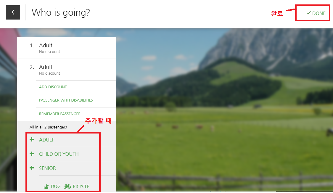 필요에 따라 인원, 반려견, 자전거를 추가하고 완료를 누릅니다.