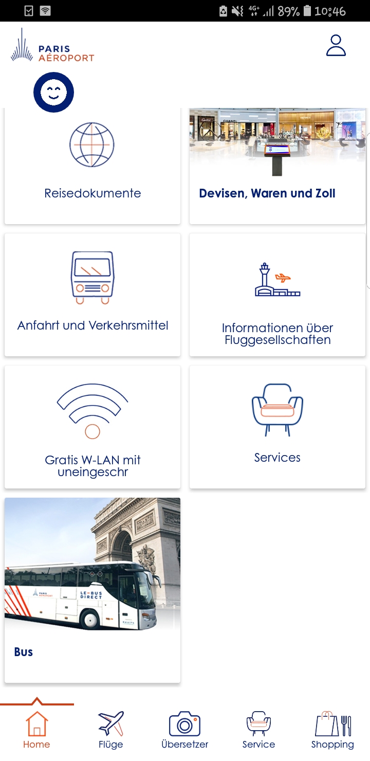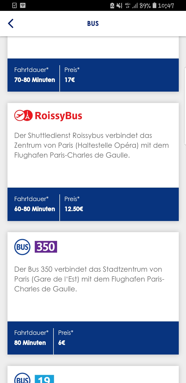 샤를 드골 공항 공식 어플인 Paris Aeroport를 설치하니 여러 버스 정보들을 볼 수 있었습니다. 공항-시내로의 여러 교통 정보도 볼 수 있습니다. 저는 버스를 타고 가기로 계획해서 버스에 대한 정보를 찾아 보았습니다.