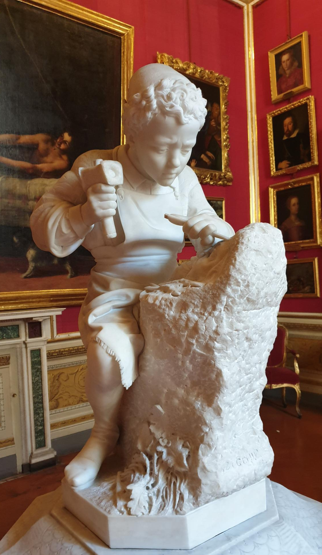 어린 미켈란젤로 대리석상인데, 미켈란젤로는 어릴 때 어머니가 병환으로 세상을 떠나 유모의 집에서 자랐는데, 유모의 남편이 석수였다고 합니다. 후에 그는 "내가 조각에 사용한 끌과 망치는 유모의 젖에서 얻은 것"이라고 했다고 합니다.