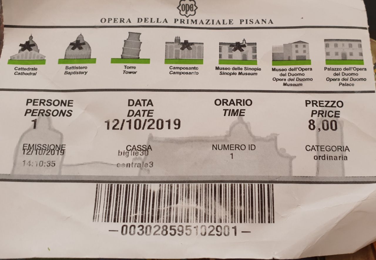 피사의 사탑에 올라가지 않은 대신 다른 건물들피사 두오모, 세례당, 컴포산토, 시노피에 박물관)을 관람했습니다. 개인적으로는 피사의 사탑만 보지 않고, 다른 곳들도 관람하길 잘 한 것 같습니다. 매표소는 사진을 찍지는 않았는데, 진노랑색 건물입니다. 공식 홈페이지에서 가격 정보, 개방 시간 등을 확인할 수 있습니다. https://www.opapisa.it/en/tickets/prices-2/