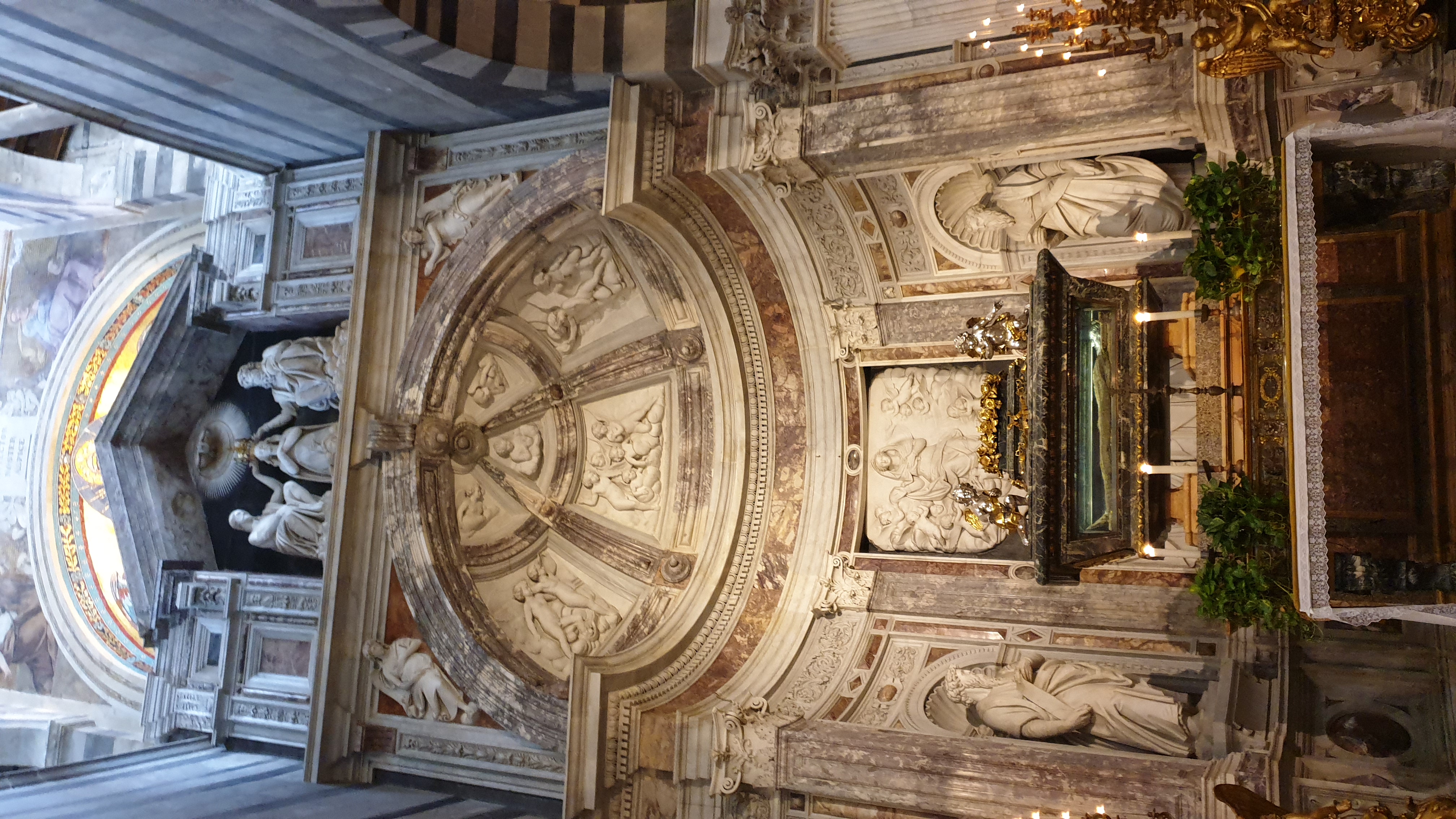 이곳에는 중세시대 귀족들의 관이 안치되었다고 합니다. 또한 로마시대의 석관도 상당 수 있다고 합니다. 사진에서 보면 특히 벽부분이 심하게 훼손된 것이 보이는데요, 2차세계 대전 때 연합군의 폭격을 받아 3일 동안이나 불에 타는 큰 화재를 겪었기 때문이라고 합니다. 복원을 위해 불에 탄 벽화들을 해체했는데, 그때 숨겨져있는 밑그림(시노피에)들이 발견되었고, 현재 시노피에 박물관에 전시해놓았습니다.