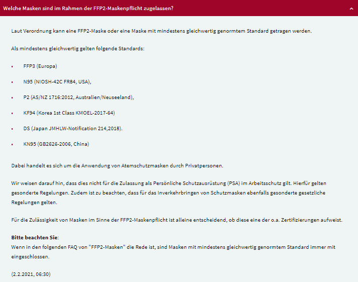 2월2일 부로, 오스트리아 보건복지부 공식홈페이지에서 KF94도 FFP2와 동일한 등급의 마스크로 인정이 된다고 공시되었습니다. KF94외에도, N95, KN95, P2, DS와 같은 여러 나라의 공식 코로나 마스크도 같은 등급으로 인정되었습니다.