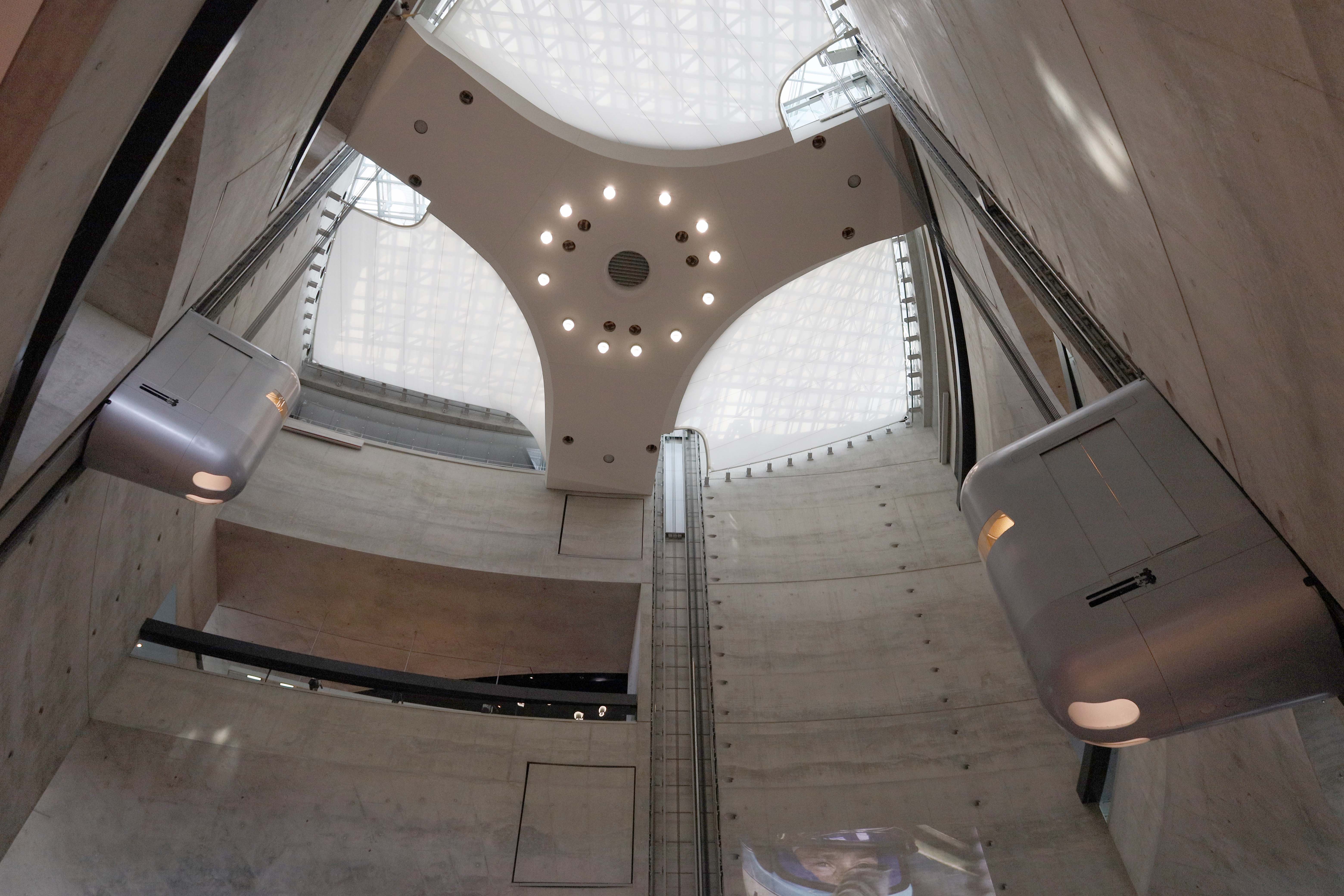 오래 기다린 후에 드디어 메인 홀로 들어서니, 마치 미래 세계에 온듯한 풍경이 펼쳐졌습니다. 노출 콘크리트 벽에 메탈 캡슐로 된 엘리베이터 바쁘게 오르내리는 모습이 SF 영화 속의 한 장면 같았습니다.